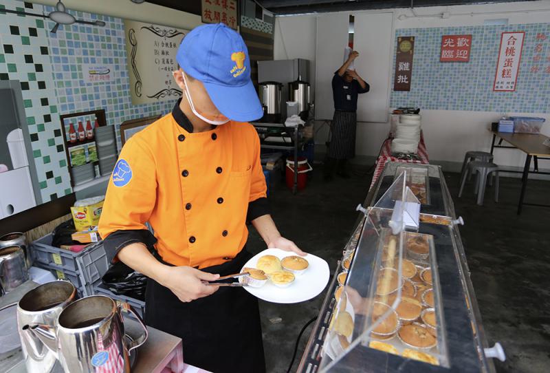 懲教署體育會昨日舉辦第65屆秋季賣物會,特設「歌記茶座」售賣雞批、菠蘿包等,讓青年囚犯親身招待客人。17歲的在囚人士阿明(化名)亦是其中一名服務員,他說,最拿手是做雞批,是在訓練場做得最多的小食,已掌握整雞批的精髓。