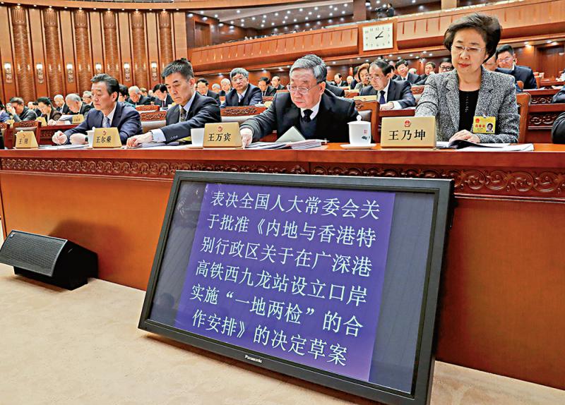 全國人大常委會昨全票通過在廣深港高鐵香港段西九龍站實施「一地兩檢」《合作安排》決定,完成「三步走」的第二步。全國人大常委會委員長張德江在閉幕會上發表講話指出,會議確認《合作安排》符合「一國兩制」方針,符合憲法和香港基本法,為推動香港與全國高鐵網絡實現互聯互通,支持香港融入國家發展大局提供了法律保障。全國人大常委會副秘書長、基本法委員會主任李飛表示,有關決定具有憲制性地位和最高法律效力,一言九鼎,不容置疑。港澳辦和中聯辦均表示,「一地兩檢」安排有利於香港更好地融入國家發展大局。特區政府表示,爭取不遲於明年二月初將「一地兩檢」本地立法草案提交立法會審議。/大公報記者 張寶峰 朱晉科