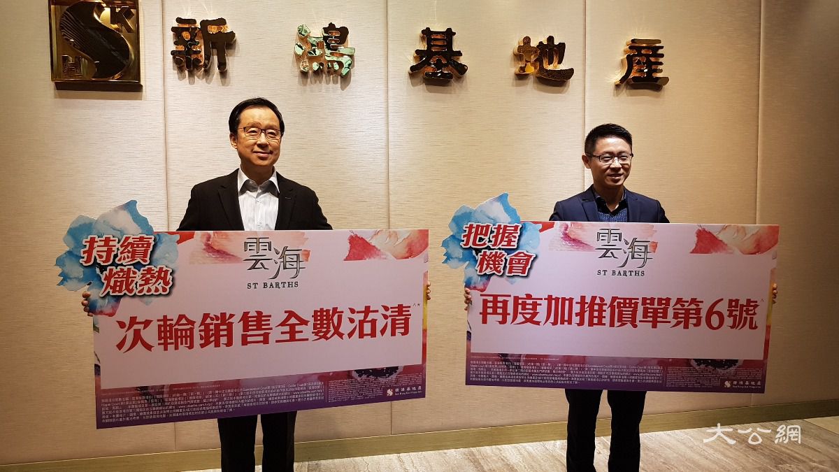 新地副董事總經理雷霆表示,雲海次輪銷售的108伙悉數沽清,整個項目累售約230伙,套現約30億元。見向隅客眾多,加推第6號價單共43伙,拆實平均呎價19253元,因今批單位包括四伙特色戶,優質單位也較多,不能與上一張價單直接比較,以標準單位而言,加價幅度約2至4%。