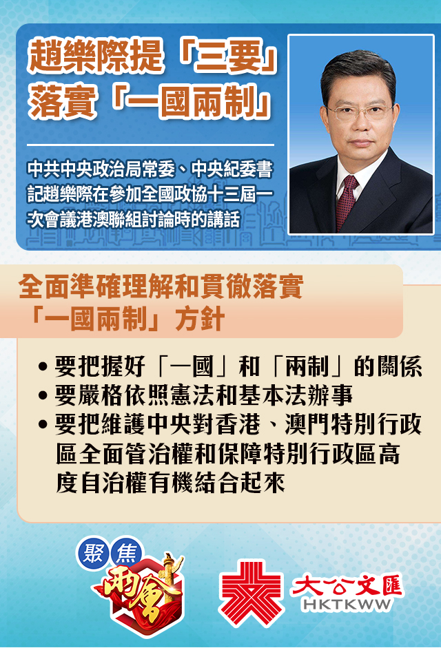 大公文匯全媒體報道:中共中央政治局常委、中央紀委書記趙樂際今日(4日)出席全國政協十三屆一次會議港澳委員聯組會議並參加討論。在談到全面準確理解和貫徹落實「一國兩制」方針時,趙樂際提出「三要」: