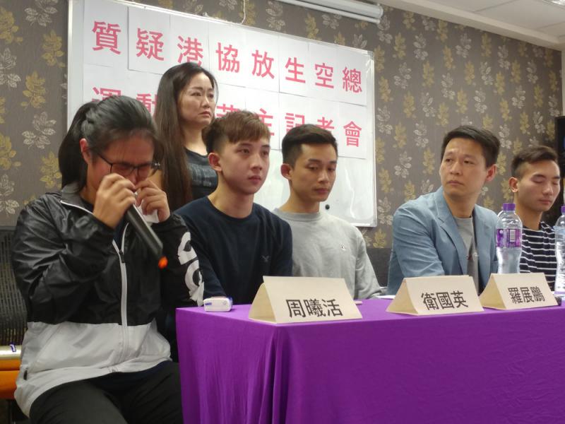 圖:16歲空手道青少年運動員周曦活(左一)在記者會上,哭訴下月將被踢出精英運動員行列,不受資助
