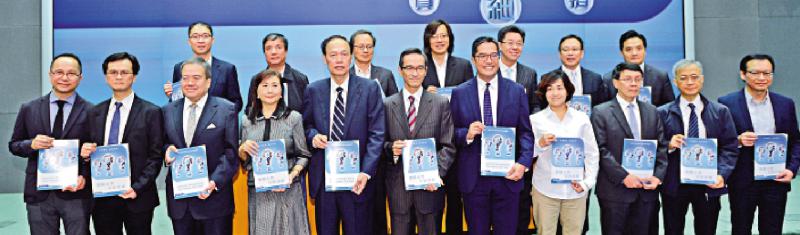 圖:土地專責小組昨宣布展開公眾諮詢,一眾成員齊齊亮相,前左六為主席黃遠輝,發展局局長黃偉綸(前排右五)亦在大合照露面 大公報記者林良堅攝