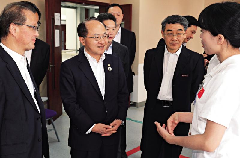 圖:中聯辦主任王志民(左二)留心聆聽醫護人員的講解