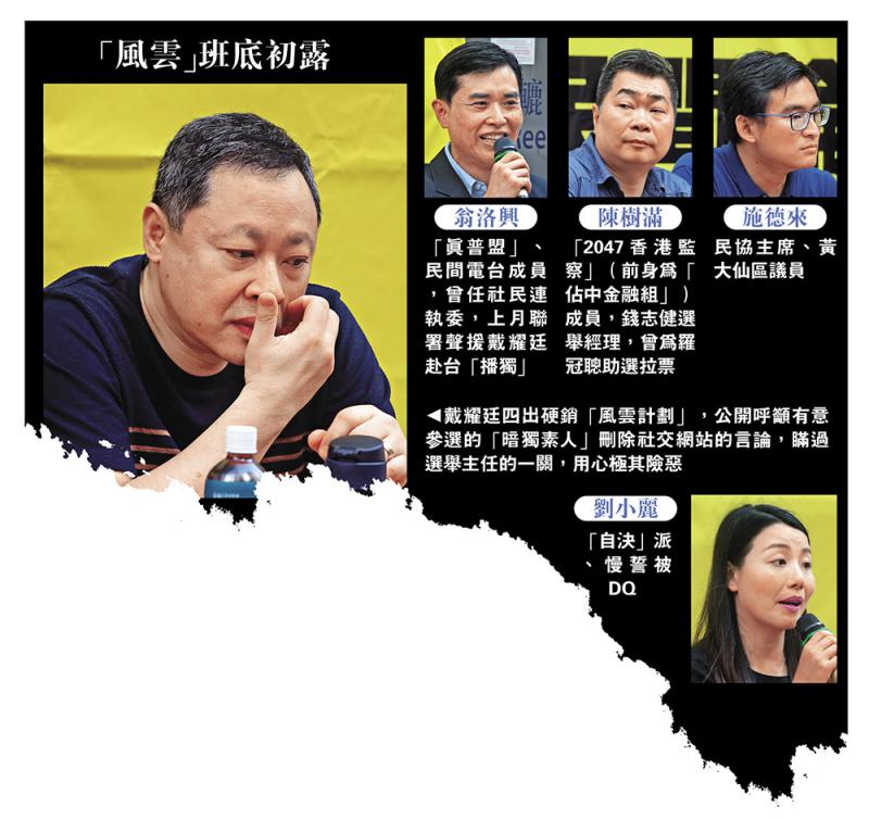禍港死心不息的戴耀廷,近日四出硬銷其所謂「風雲計劃」,聽其號令硬闖區選的「風雲」爛頭蟀亦漸露端倪。戴耀廷昨日於街頭民間論壇大放厥詞,「自決派」劉小麗、民協、上屆區選「傘兵」等充撐場面,惟民主黨、公民黨等反對派「大戶」全數缺席。早已露出「煽獨」真面目戴耀廷聲稱,其區選班底以所謂政治素人為主,預計有十多人會被「DQ」,更公開呼籲有意參選的「素人」刪除社交網站的言論,防止選舉主任截圖,變相承認風雲計劃有「暗獨」分子存在。/大公報記者陳達堅
