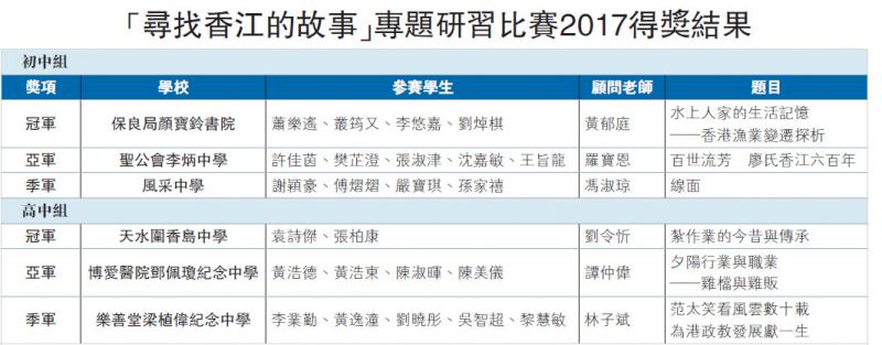 「尋找香江的故事」專題研習比賽為其中之一,另外還有中式餐桌禮儀體驗、歷史場景表演及專題講座、香港地區歷史考察團、「香港百年蛻變」圖片展覽等,吸引了一批熱愛研習香港歷史文化課題的學生參與,為香港中學師生帶來不一樣的歷史學習,讓他們體悟刻苦拚搏、自強不息、同舟共濟的香港精神,加強對本土歷史及中國近代歷史的了解,冀望能繼續傳承香港精神,培養下一代的正確價值觀。