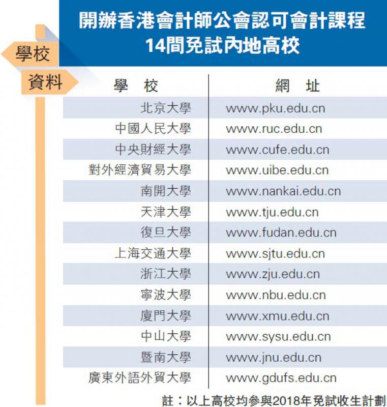 若同學畢業後打算在香港成為會計師,最直接的入讀資格為持有認可的會計學學位。現時已有17所內地高校(包括14所參加2018年免試收生計劃的內地高校)的會計課程獲得香港會計師公會評審認可,完成該等高校認可會計課程(包括專業資格課程(QP)規定的所有必修及選修科目)的畢業生才可直接報讀專業資格課程(QP)。