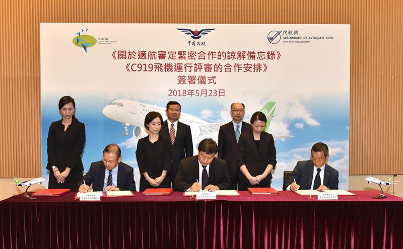 圖:國家民航局、香港民航處和澳門民航局簽署C919飛機運行評審合作安排