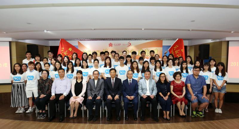 圖:香港大公文匯傳媒集團主辦的「2018范長江行動」啟動禮上,民政事務局局長劉江華(前排左六),中聯辦青年工作部部長陳林(前排左四),香港大公文匯傳媒集團董事長姜在忠(前排左五),港區全國人大代表、聯泰集團有限公司行政總裁陳亨利(前排右四)等主禮嘉賓,與一眾學子合影
