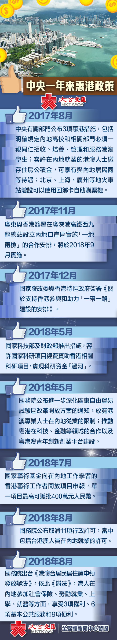 大公文匯全媒體報道:國務院新聞辦公室今日(16日)召開發布會,公布國務院辦公廳近日將印發《港澳台居民居住證申領發放辦法》,並於9月1日正式實施。依此《辦法》,港人在內地參加社會保險、勞動就業、上學、就醫等方面,享受3項權利、6項基本公共服務和9項便利。過去一年來,國家還出台了不少惠港政策,一圖告訴你有哪些。