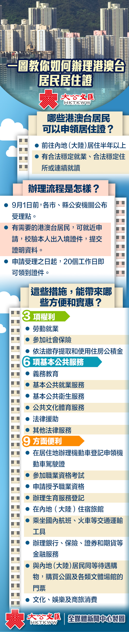 大公文匯全媒體報道:國務院新聞辦公室今日(16日)召開發布會,公布國務院辦公廳近日將印發《港澳台居民居住證申領發放辦法》,並於9月1日正式實施。哪些港澳台居民可申領居住證?如何辦理?優惠措施有哪些?一圖告訴你!