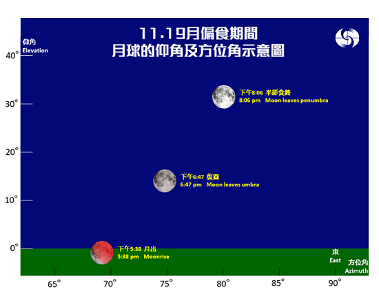 天文台指,今次月食過程中,月球在「食甚」時仍然處於地平線以下,因此在香港看到的月亮會帶食而出。今日的月出時間是下午5點38分, 月亮到傍晚6點47分就會回復圓形,整個月食過程會在晚上8點零6分完成。