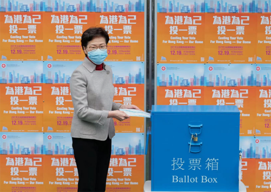 林鄭又說,這次選舉規模龐大,運作模式複雜,涉及選舉委員會界別、功能界別和地方選區三個板塊,籌備工作涉及眾多人力、物力和資源。今日的投票在公開、公平和誠實的情況下進行,整體過程大致順利;各項優化措施,包括為長者、孕婦及殘疾人士設立「關愛隊」、大量增設發票櫃枱、使用電子選民登記冊系統發出選票等,都為選民提供了便利,成效令人滿意。至於因受疫情影響而為身處內地的登記選民安排在邊境管制站特設的投票站投票,在內地相關單位的全力協助下,亦順利舉行。