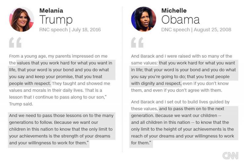 米歇爾曾在2008年民主黨大會發表演講,她曾說,她與奧巴馬有許多共同之處,像是「為渴望的生活勤奮工作,言語就是契約,話說出口就要履行諾言。」梅拉尼亞在共和黨大會上則說,「為渴望的生活勤奮工作、言語就是契約,話說出口就得信守承諾,從小我的父母讓我明白這些價值觀的重要性。」