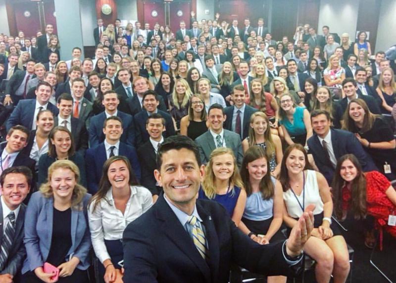 瑞安在國會山實習講座上與在場實習生大玩自拍,並將照片上傳Instagram寫道:「我想這創下紀錄—一張自拍照,最多國會山實習生入鏡。」這張照片得到眾多負面評論,一位網友說:「這張照片白到我必須戴太陽眼鏡才能直視它。」