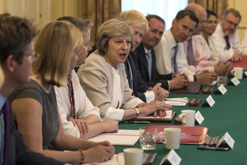 圖:英國首相文翠珊(左三)19日出席其首次內閣會議 法新社