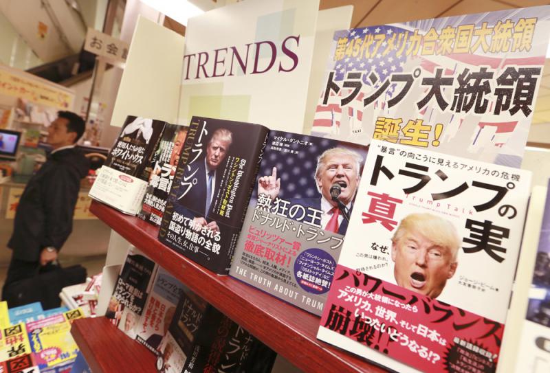 日本政界憂心,但民間就掀起一股「特朗普熱」。一家製造橡膠材質面具的公司推出「特朗普面具」,竟然賣到缺貨,讓原本下周推出的東京都知事小池百合子的面具都要延後發售。東京一家書店也緊急補進有關特朗普的書籍。有一名62歲的市民看着有關特朗普的書籍時表示,對日美關係會變得如何感到很不安,一定要多讀些有關特朗普的書。
