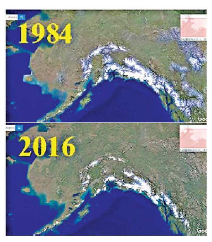 圖:谷歌縮時影片顯示,阿拉斯加的哥倫比亞冰川面積有所減少 網上圖片