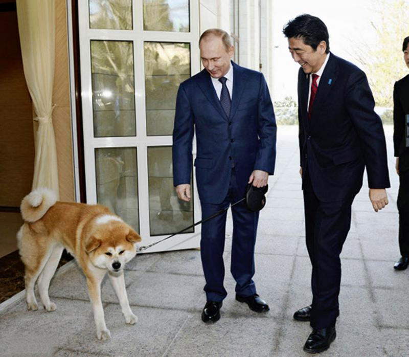 圖:2014年俄總統普京會晤訪俄的日本首相安倍,秋田犬「夢」一同出鏡\資料圖片