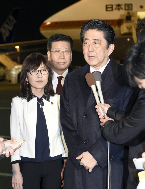 日本首相安倍晉三(右)26日在羽田國際機場接受訪問/美聯社