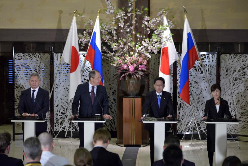 日本外務大臣岸田文雄、防衛大臣稻田朋美、俄羅斯外長拉夫羅夫、國防部長紹伊古,當天在東京外務省的飯倉公館召開「2+2」會談。在此之前,還舉行了雙方外長對外相、防長對防相的單獨會談。