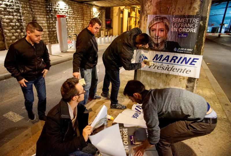 圖:國民陣線年輕成員二月在里昂為勒龐貼海報\路透社