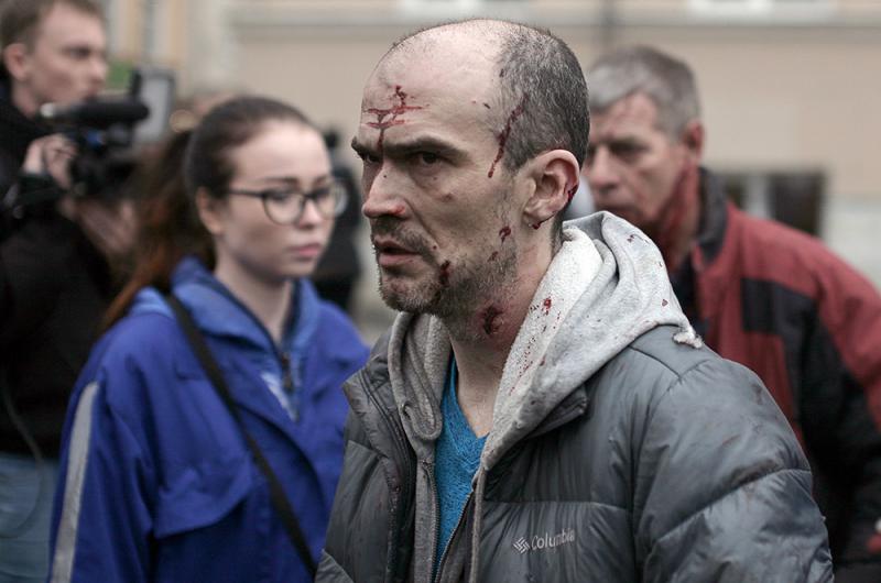 圖:聖彼得堡恐襲現場,一名受傷男子臉上帶有血跡\法新社