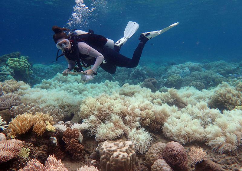 圖:潛水員檢查珊瑚白化情況\網上圖片