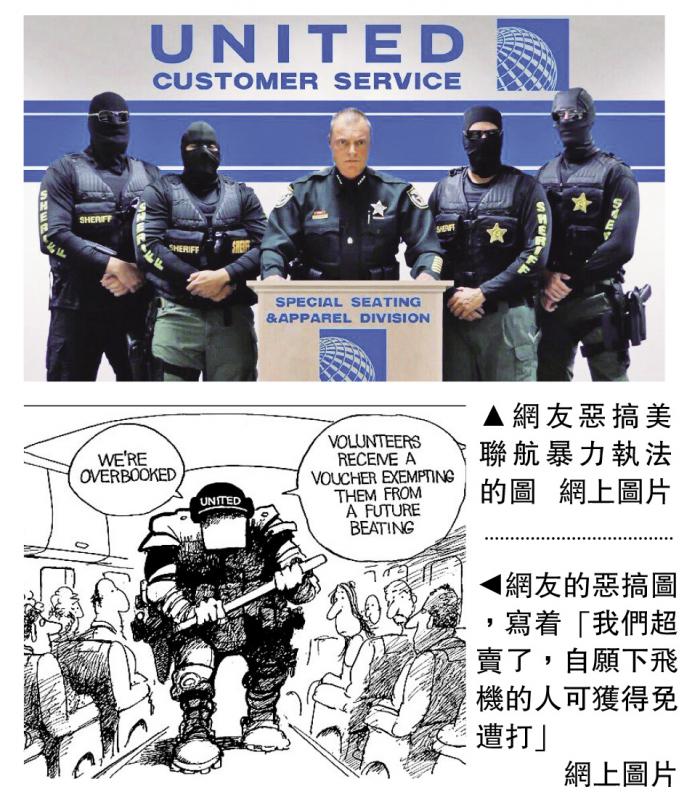 【大公報訊】綜合英國《每日郵報》、《僑報》報道:美國聯合航空把華裔乘客粗暴拖走一事,在社交媒體上引起一片嘩然,尤其在華人民眾當中引發一片罵聲。網友在推特和Facebook等社交網站上,惡搞各種圖片嘲諷和譴責美聯航,有網友把剪掉美聯航的里程卡,同時呼籲抵制這家暴力對待乘客的航空公司。