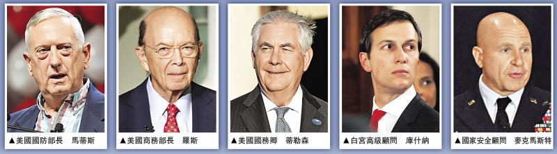 《華爾街日報》分析,現時有五位幕僚正在塑造美國政府新的外交政策。他們是美國國務卿蒂勒森、國防部長馬蒂斯、白宮國家安全顧問麥馬斯特、商務部長羅斯,以及白宮高級顧問庫什納。分析指出,他們整體穩定了新政府的策略思維,將其推向更傳統的軌道。