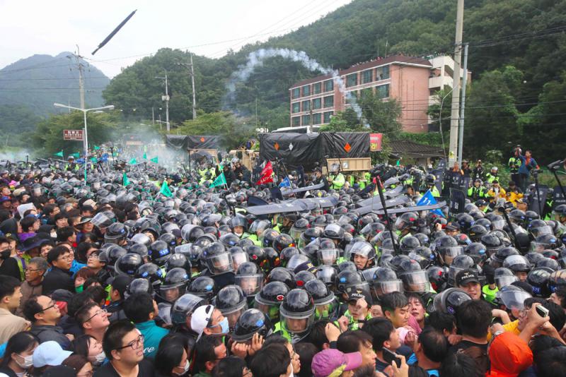 警方共向星州郡韶成里投入8000餘名警力,對示威人群進行10餘次警告,試圖驅散示威者,但遭到示威者的強烈抵抗,民眾高呼「反對暴力警察」「你們是美國警察嗎」「誓死抵制『薩德』」等口號,有人還向警察投擲水瓶。示威者在韶成里會館前的兩車道上停放30餘輛車,坐在汽車周圍與警察對峙。30餘名示威者用繩子互相捆綁在一起,還有部分人用鐵鏈將身體與汽車鎖在一起。警察將頑強抵抗的示威者一點一點推開,並將汽車拖走,70多米長的示威隊伍逐漸被警方驅散。