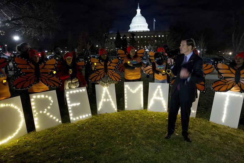 圖:示威者21日晚在國會山外呼籲支持DACA