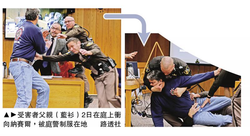 圖:受害者父親(藍衫)2日在庭上衝向納賽爾,被庭警制服在地/路透社