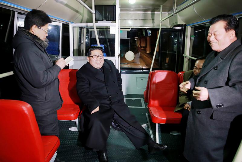 圖:金正恩(中)在平壤試乘無軌電車/法新社