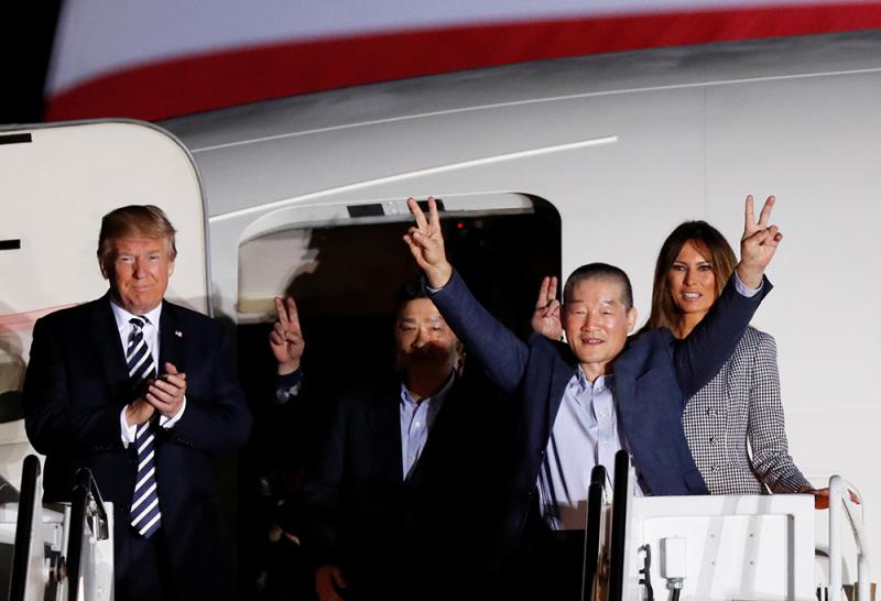 三名美國公民在美國國務卿蓬佩奧赴平壤訪問後獲釋,與蓬佩奧一同返回美國,專機在當地時間凌晨約2時40分降落華府近郊的安德魯斯聯合基地,跑道邊緣2部消防車升起雲梯,雲梯間掛上一幅巨大美國國旗。白宮發言人表示,三人將被帶至附近馬里蘭州的一家軍事醫學中心,進行進一步醫療檢查。