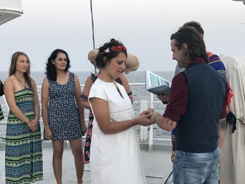 「希望號」的每一段航程都有令人難忘的故事,在西非巡航也不例外。從塞拉利昂首都弗里敦啟航的第二天下午,趁着海上落日,一場既簡單又浪漫的海上婚禮在這裏舉行。新娘肖安娜是負責後勤的南非白人,新郎則是美籍機械師喬西。他們兩年前在同樣的海洋保護巡航中相識相戀,短暫的航程結束後,喬西禁不住思念從美國徑直飛到南非陪伴真愛。