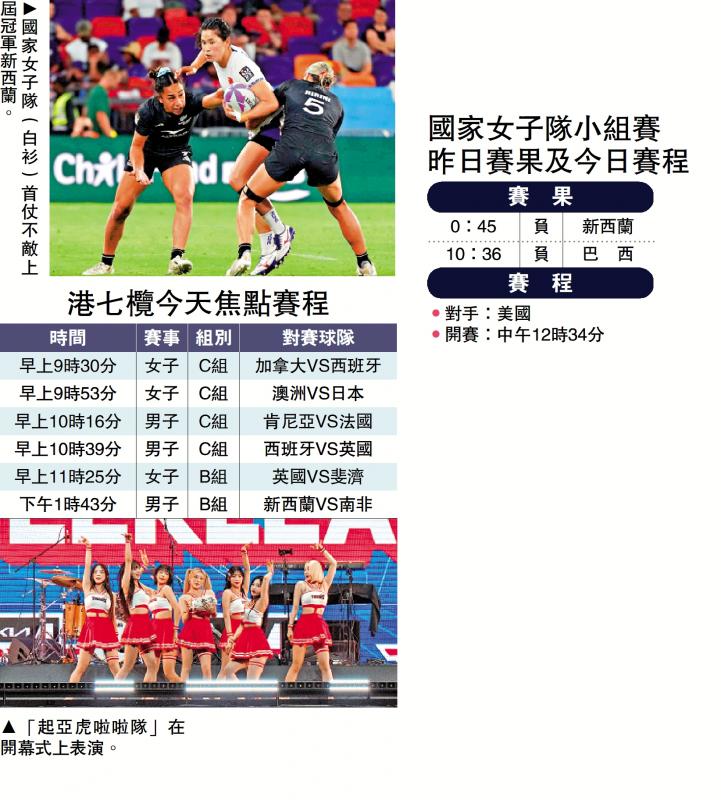 【大公報訊】記者朱家立報道:中國女子七人欖球代表隊於昨晚在啟德主場館出戰香港國際七人欖球系列賽的核心賽,並於A組先後對陣新西蘭及巴西。最終國家隊以0:45不敵衛冕冠軍新西蘭,隨後亦以10:36負巴西。今天國家隊將迎來最後一輪賽事對陣美國,力爭取得小組賽首勝。