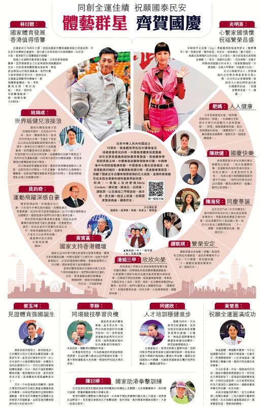 迎來中華人民共和國成立76周年,香港體育界包括中國香港足球總會會長貝鈞奇、中國香港體育協會暨奧林匹克委員會義務副秘書長黃寶基、香港體育學院院長蔡玉坤、中國香港劍擊隊領隊林衍聰、中國香港乒乓球隊總教練李靜、中國香港七欖名宿姚錦成、武術運動員何健欣、拳擊運動員陳衍婷、柔道教練黃楚恩,回顧了國家近年在體育發展取得的巨大成就,並期待香港健兒在本屆全運會和殘特奧會再創佳績。同時,一眾藝人包括肥媽Maria Cordero、陳欣健、陳海兒、炎明熹、譚凱琪,以及港姐三甲陳詠詩、施宇琪、袁文靜一起送上祝福,祝願國家繁榮昌盛、國泰民安。\大公報記者 溫穎芝、梁潤森、張銳、朱家立、郭悅盈