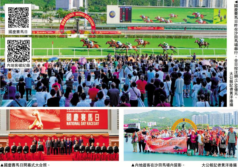 為慶祝中華人民共和國成立76周年,香港賽馬會昨日在沙田馬場舉行國慶賽馬日。國慶賽馬日洋溢着濃厚的節日氣氛,沙田馬場及跑馬地馬場合共吸引34073名觀眾入場,當中包括逾12000名內地遊客,不僅較去年同期增長了1.5倍,更創下歷來內地遊客單日入場人數的新紀錄,全日投注額達到15.68億元。馬會為提升觀眾的觀賞體驗,特意安排了成都舞團HOMIES作跨越傳統的開幕表演,新設施「連薈」和「天馬驛」則帶來沉浸式數字化賽馬和娛樂體驗。\大公報記者 朱家立(文)、許棹傑(視頻)