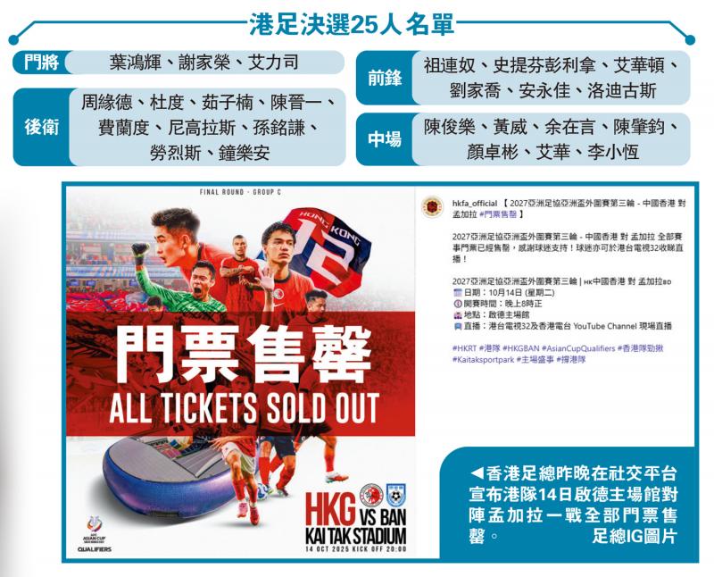 圖:香港足總昨晚在社交平台宣布港隊14日啟德主場館對陣孟加拉一戰全部門票售罄。\足總IG圖片