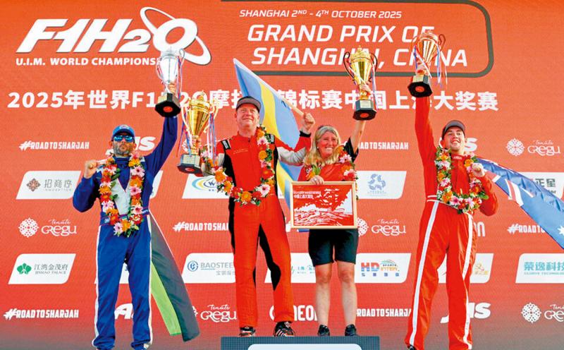 【大公報訊】4日,2025年世界F1H2O摩托艇錦標賽中國上海大獎賽正賽在寶山長灘水域落下帷幕。經過一番驚心動魄的激烈角逐,最終來自瑞典的衛冕世界冠軍安德森(左二)榮耀加冕,維多利隊多仁特和瑞典隊的特拉斯克分別獲亞軍和季軍。而在3日拿下生涯首個桿位、卻因更換發動機正賽從第19位發艇的「00後」小將、沙迦隊阿蘭德以第四名完賽。中國天榮F1H2O摩托艇隊的彼得.莫林同樣表現搶眼,從第14位出發,最終斬獲第八。 大公報記者夏微上海報道