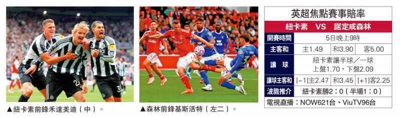 【大公報訊】記者梁潤森報道:紐卡素今晚將於英超賽事中,主場迎戰諾定咸森林。紐卡素開季成績未如理想,主要與此前遭遇強敵有關;如今球隊陣容已大致穩定,有望憑藉主場優勢在英超重返勝軌。諾定咸森林在開季首戰擊敗賓福特後表現無以為繼,近5場聯賽僅取得兩分,加上作客表現一向打折扣,今仗不宜過分看好。讓球盤為紐卡素讓半球、一球,可考慮投注上盤圖利。(NOW621及ViuTV96台今晚9時直播)