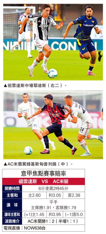 【大公報訊】記者梁潤森報道:意甲第6輪香港時間周一凌晨上演一場焦點大戰,由祖雲達斯主場迎戰AC米蘭。主隊祖雲達斯在聯賽接連遭遇和局,暴露出進攻火力不足的問題,今仗面對狀態巔峰的榜首球隊AC米蘭,若能搶得1分已屬超額完成。AC米蘭開季以來氣勢如虹,聯賽已豪取4連勝,其間僅失1球,防守固若金湯,今仗有力爭取5連勝。讓球盤開出平手盤,AC米蘭值得看高一線。(NOW638台明晨2時45分直播)