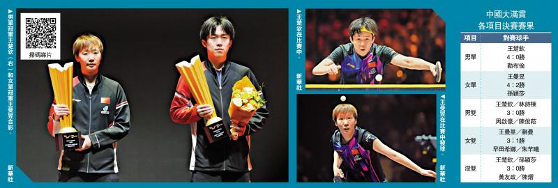 2025WTT中國大滿貫賽5日落下帷幕,男單、女單冠軍歸屬塵埃落定。中國球手再度包攬雙冠,王曼昱大比分4:2力克孫穎莎斬獲冠軍,成為本站女單和女雙的「雙冠王」。男單方面,在準決賽歷經7局苦戰逆轉隊友向鵬晉級的王楚欽,則於決賽以4:0的絕對優勢橫掃法國球手勒布倫,將冠軍收入囊中,並成為本次賽事的「3冠王」。國家隊在家門口實現本屆賽事「5金全包」,再度彰顯世界乒壇「夢之隊」的實力。\大公報記者 蘇雨潤北京報道