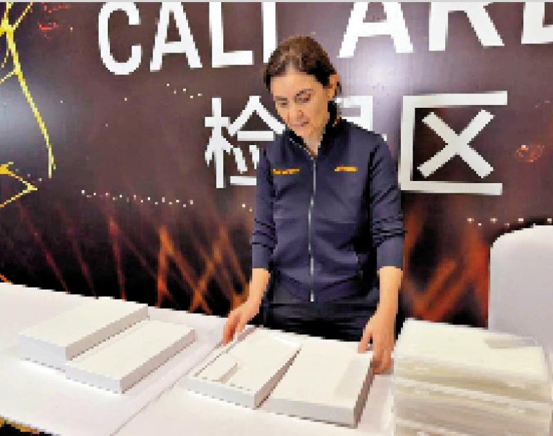 圖:克羅塔在展示紙質「球拍檢測盒」。\新華社