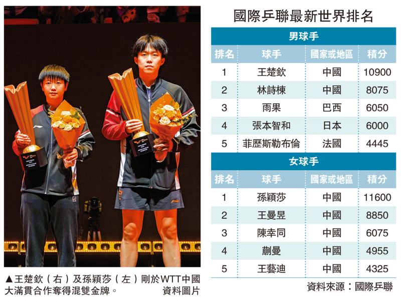 圖:王楚欽(右)及孫穎莎(左)剛於WTT中國大滿貫合作奪得混雙金牌。\資料圖片