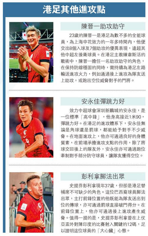 效力中超球會深圳新鵬城的安永佳,是一位標準「高中鋒」,他身高接近1米90,彈跳力好。在港足的進攻體系下,安永佳無論是角球還是罰球,都能給予對手不少威脅。在地面進攻上,他亦可通過良好的身體質素,在前場承擔進攻支點的作用,除了將球交回後上的隊友外,安永佳亦可通過跑位牽制對手部分防守球員,讓隊友獲得空位。