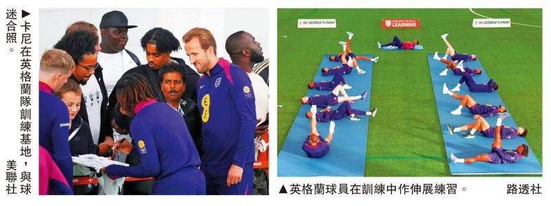 左圖:卡尼在英格蘭隊訓練基地,與球迷合照。\美聯社;右圖:英格蘭球員在訓練中作伸展練習。\路透社