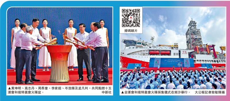 全運火種前有源於泰山之巔,今有擷自深海千米之底。9日上午,在中國首艘自主研發建造的大洋鑽探船「夢想」號見證下,第15屆全運會和殘特奧會火種採集儀式在位於廣州南沙區的廣州海洋地質調查局科考碼頭舉行。與歷屆全國性、國際性大型賽會不同,本屆全運會聖火在超深海(南海1522米深處)環境下,實現可燃冰的採集及點燃,這是全球體育運動史上首次在深海海底獲取綠色「火種」。\大公報記者 敖敏輝、帥誠廣州報道