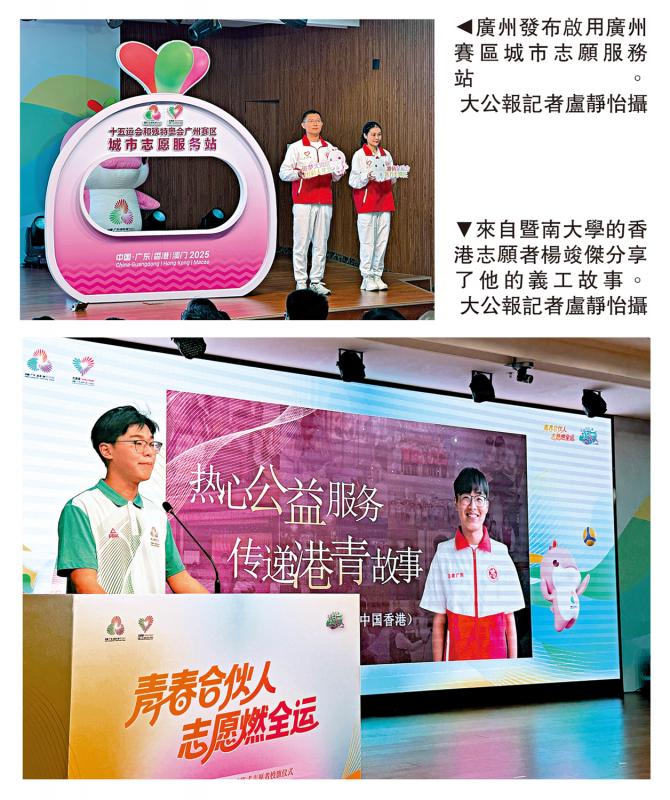 上圖:廣州發布啟用廣州賽區城市志願服務站。下圖:來自暨南大學的香港志願者楊竣傑分享了他的義工故事。\大公報記者盧靜怡攝