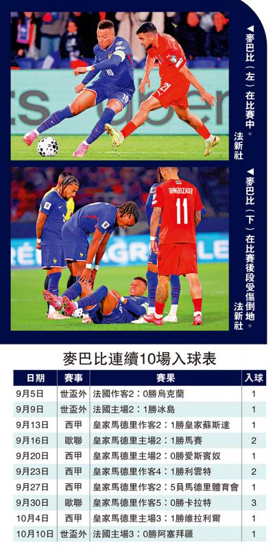 法國周五在世界盃外圍賽歐洲區D組主場迎戰阿塞拜疆,皇馬前鋒基利安麥巴比以精彩表現為法國隊先開紀錄,創下個人連續10場在球會及國家隊賽事中入球的紀錄。法國最終以3:0大勝,全取3分後,小組3戰全勝高踞榜首。然而,球隊亦傳來壞消息,麥巴比在比賽末段觸傷足踝舊患,可能因此缺席14日(下周二)作客對陣冰島的世界盃外圍賽。\大公報記者 梁潤森